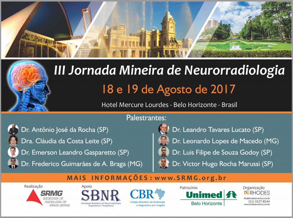 A Sociedade de Radiologia e Diagnóstico por Imagem de Minas Gerais (SRMG), com o apoio da Sociedade Brasileira de Neurorradiologia Diagnóstica e Terapêutica (SBNR), realizará a terceira edição da Jornada Mineira de Neurorradiologia nos dias 18 e 19 de agosto.